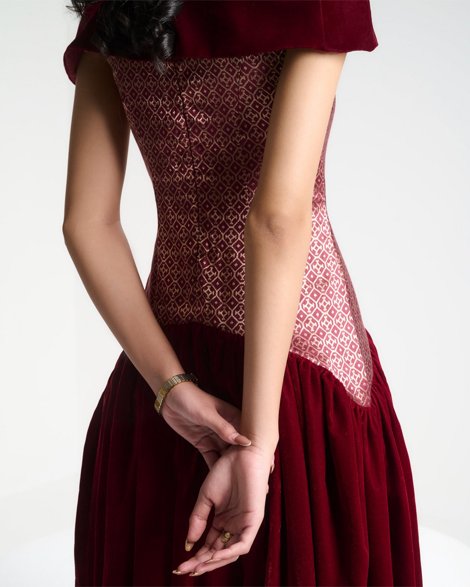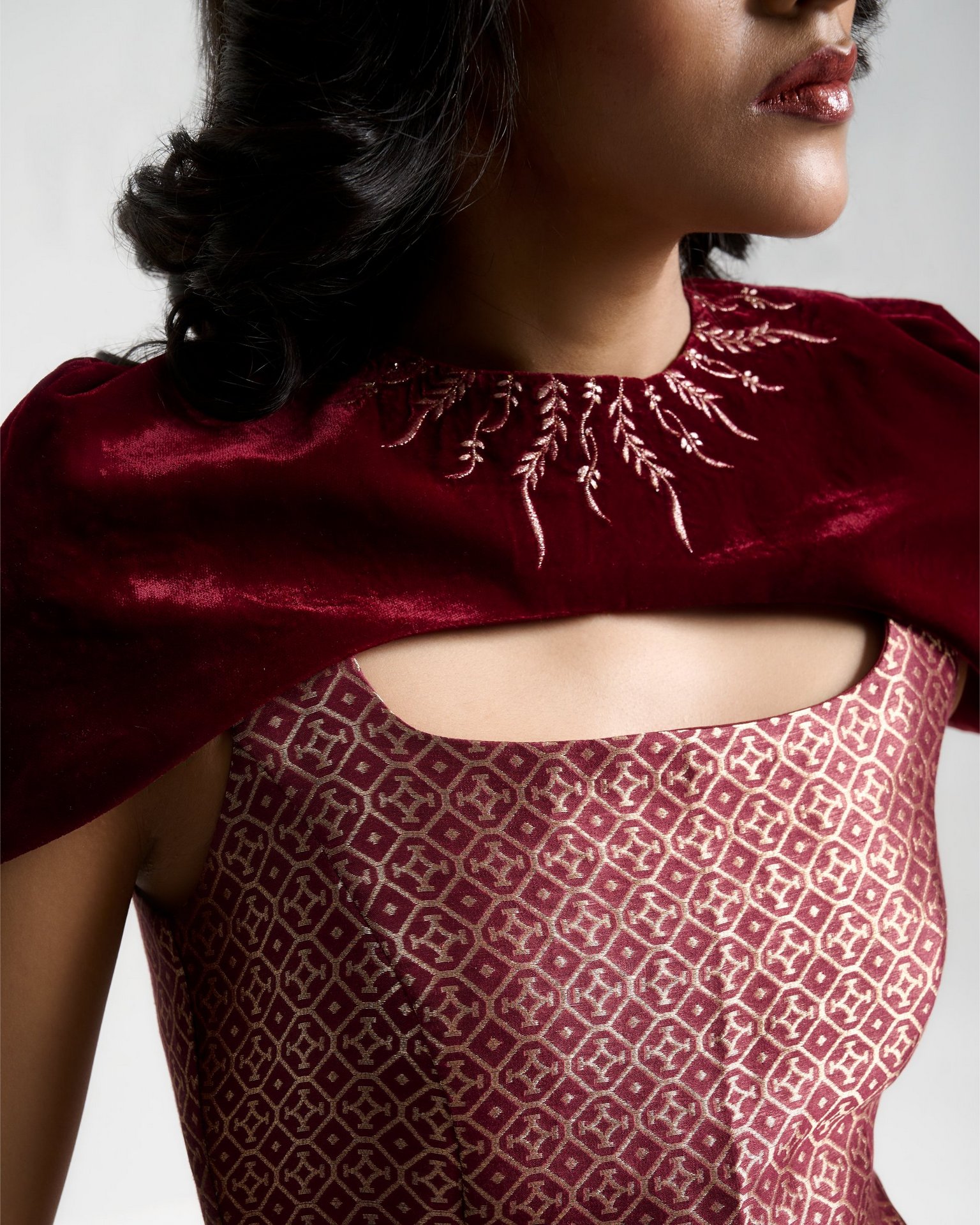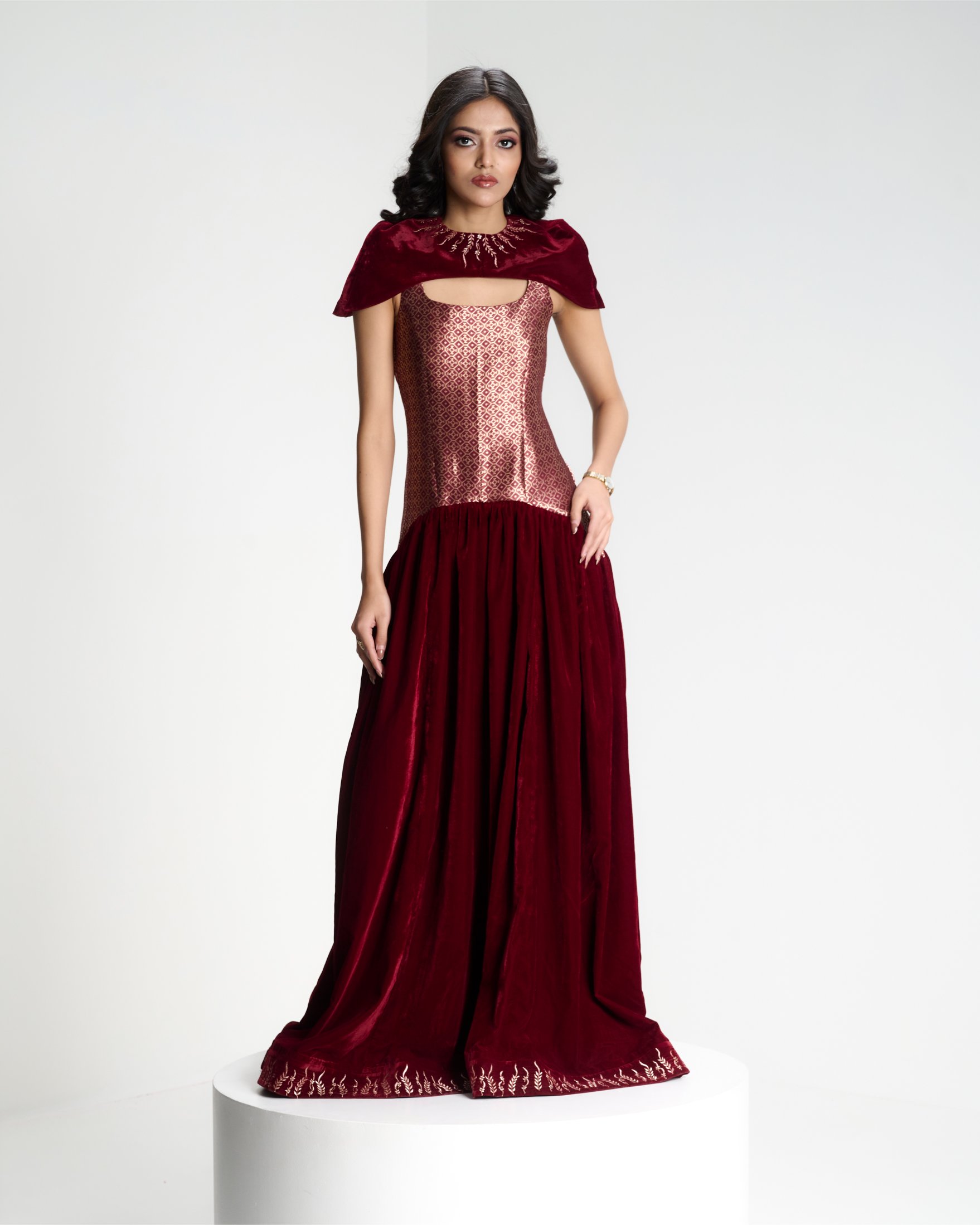 Banarasi zari meets sculpted velvet in a silhouette that balances heritage with modern form. Kailessa introduces the language of the house