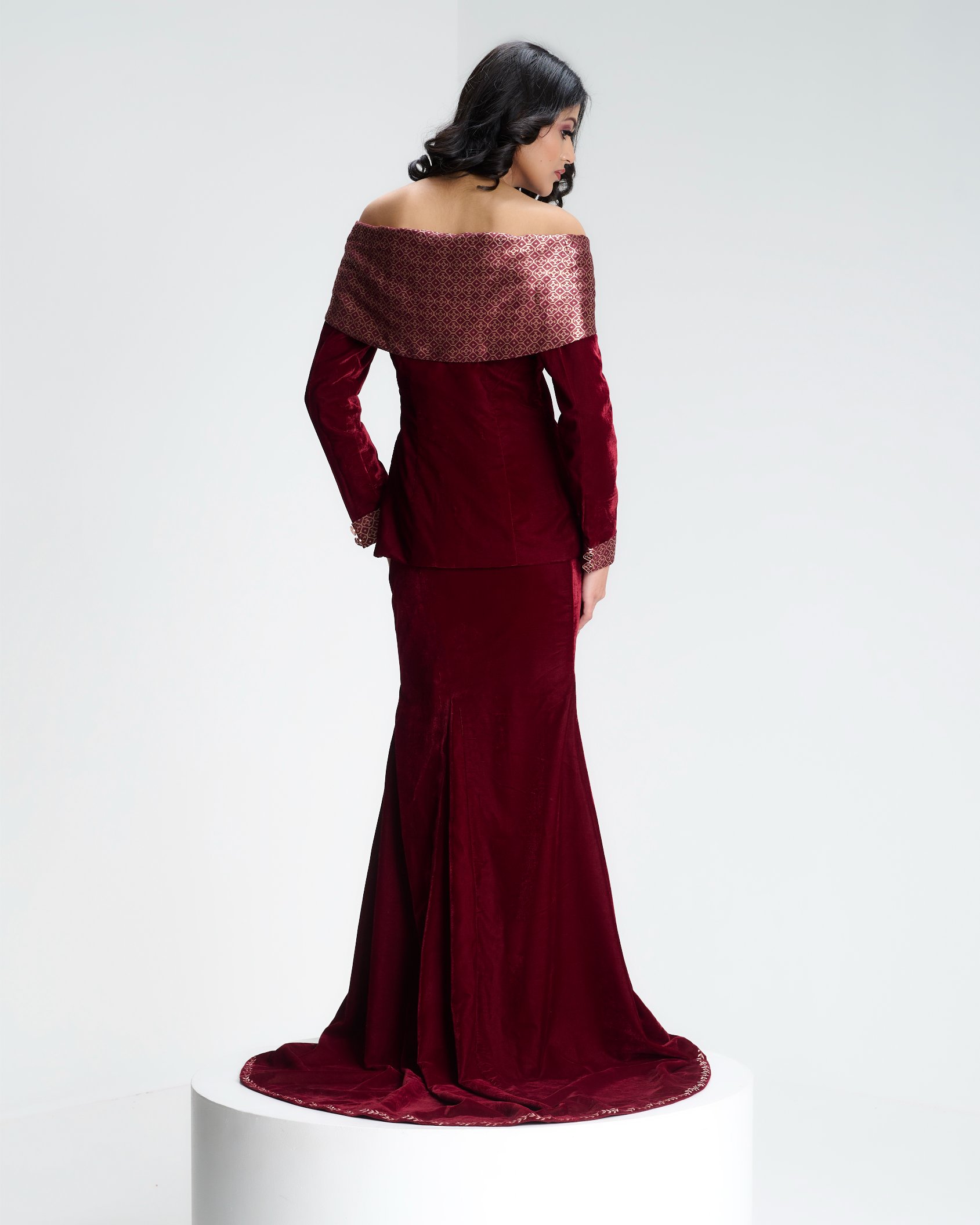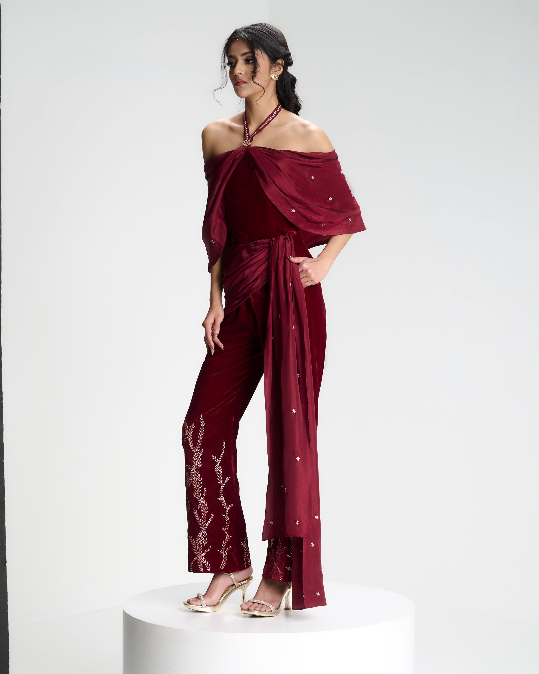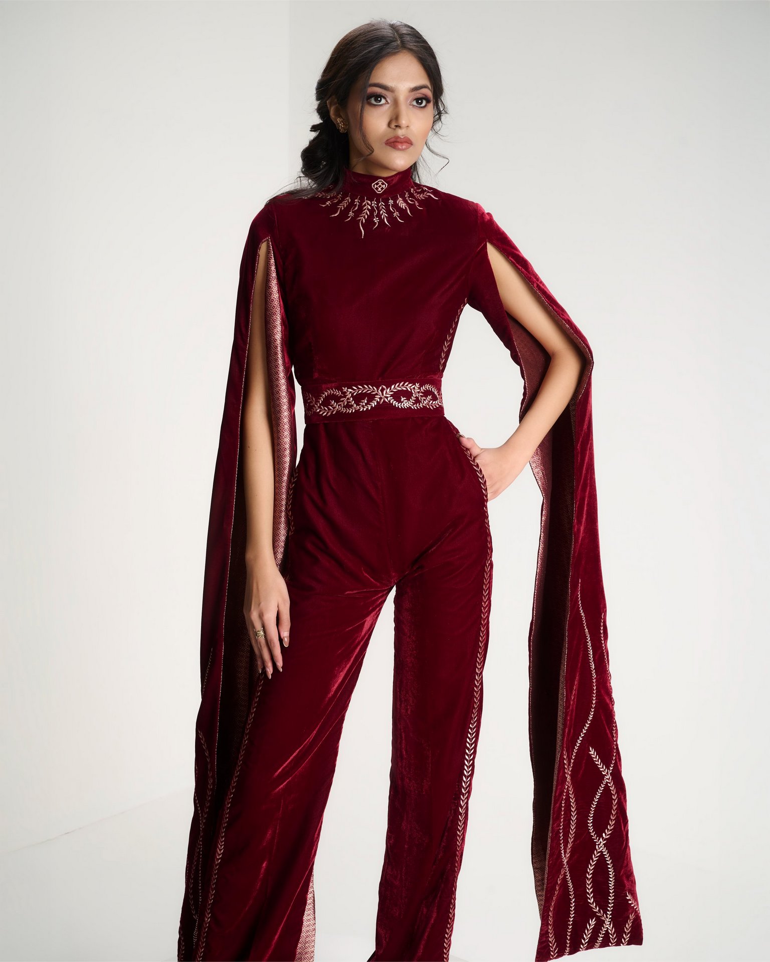Banarasi zari meets sculpted velvet in a silhouette that balances heritage with modern form. Kailessa introduces the language of the house