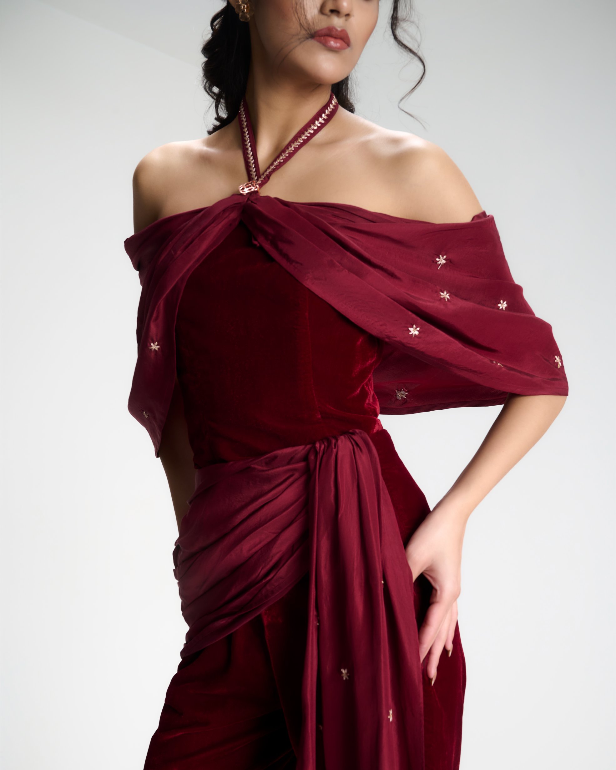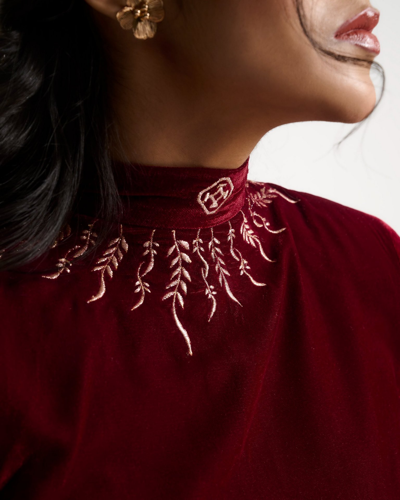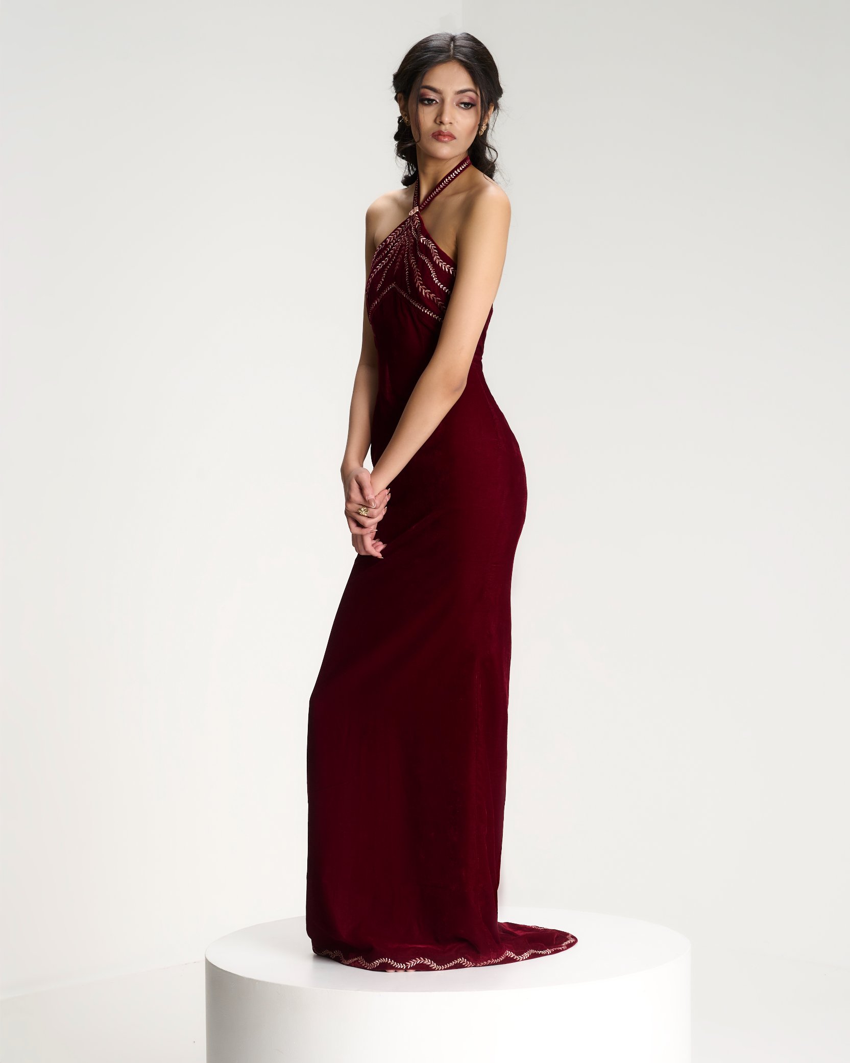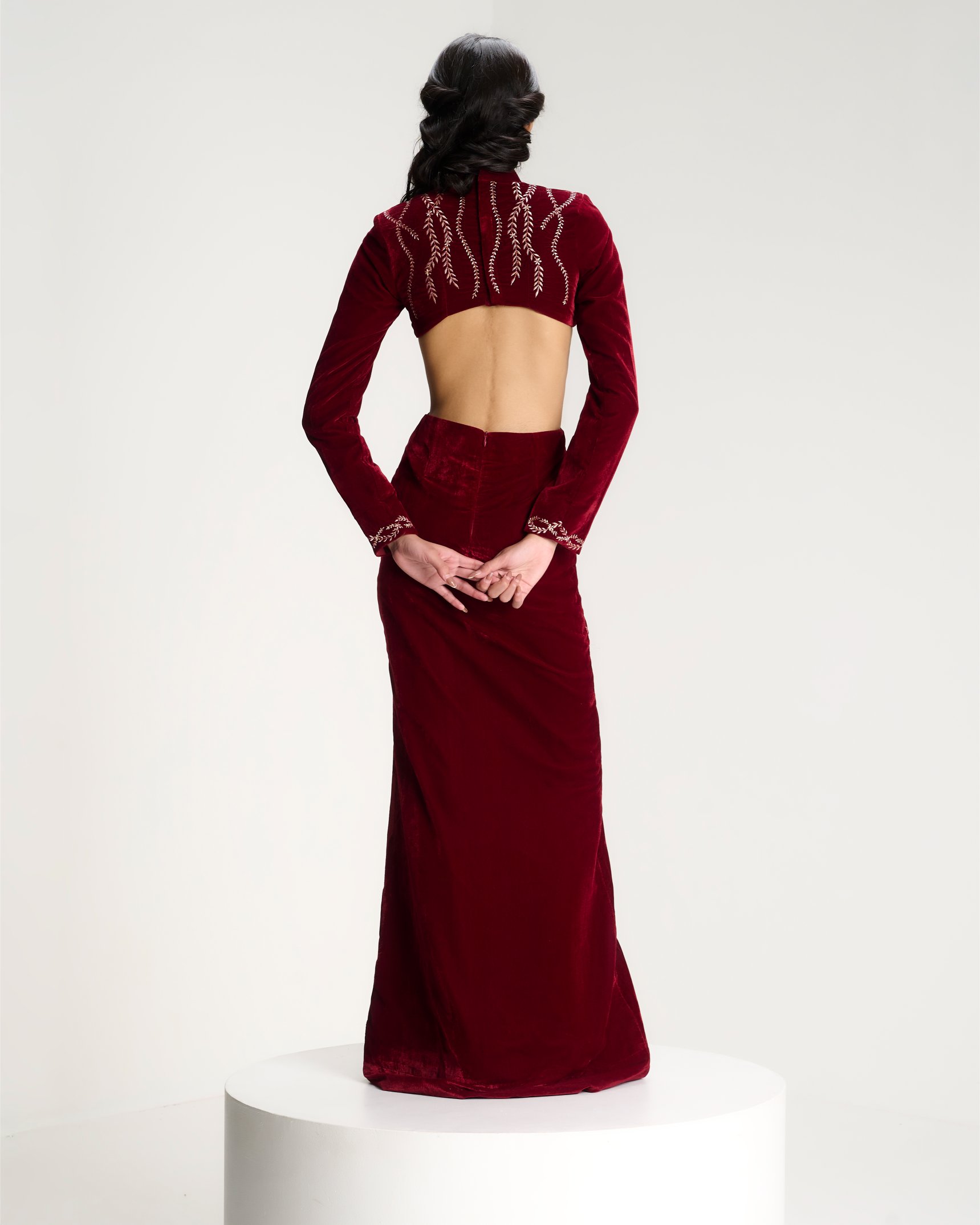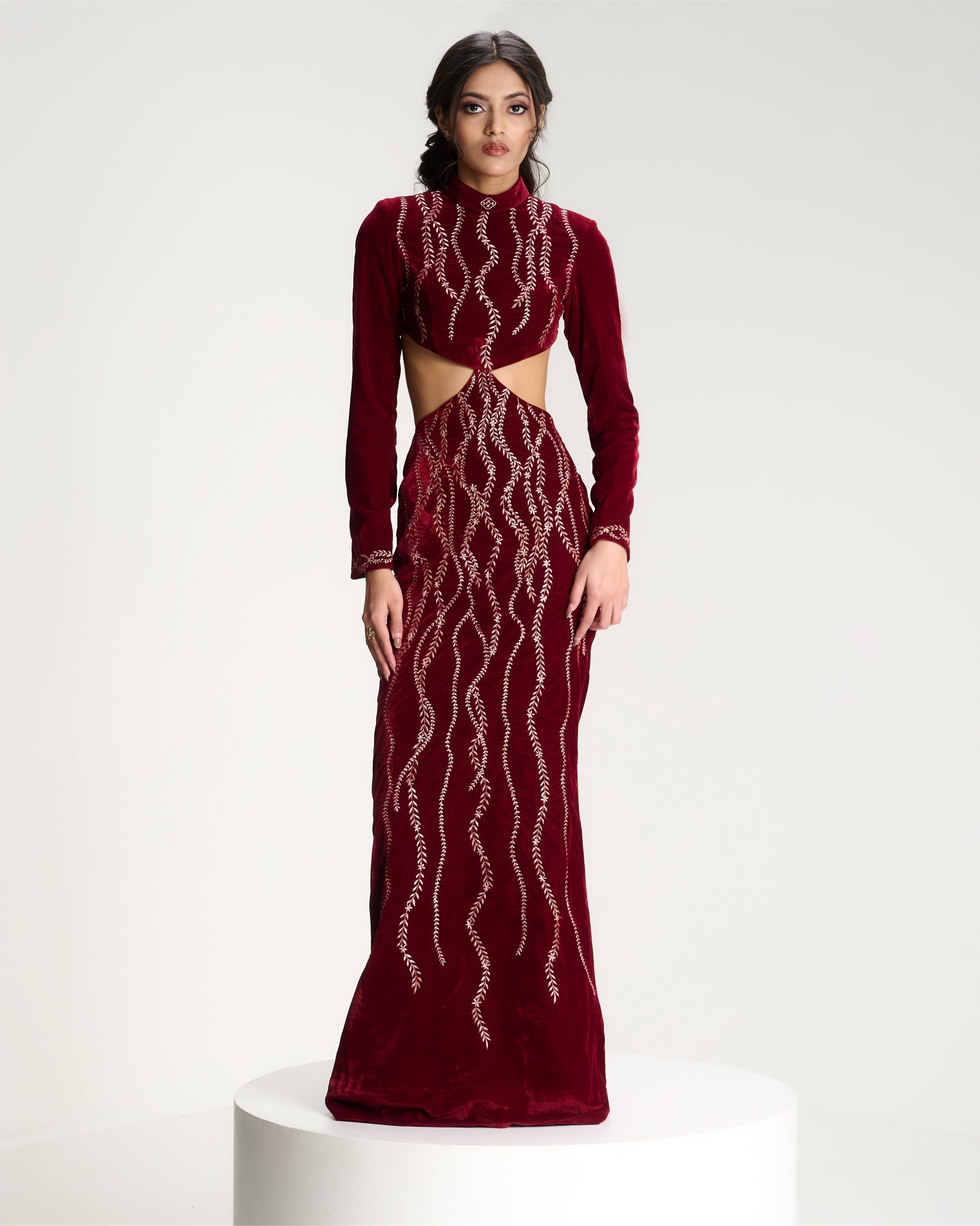 Discover the lookA moment of quiet before expression. Embroidery radiates from the waist like roots unfolding from a single point of origin. Kresha speaks of inner strength expanding outward into presence.