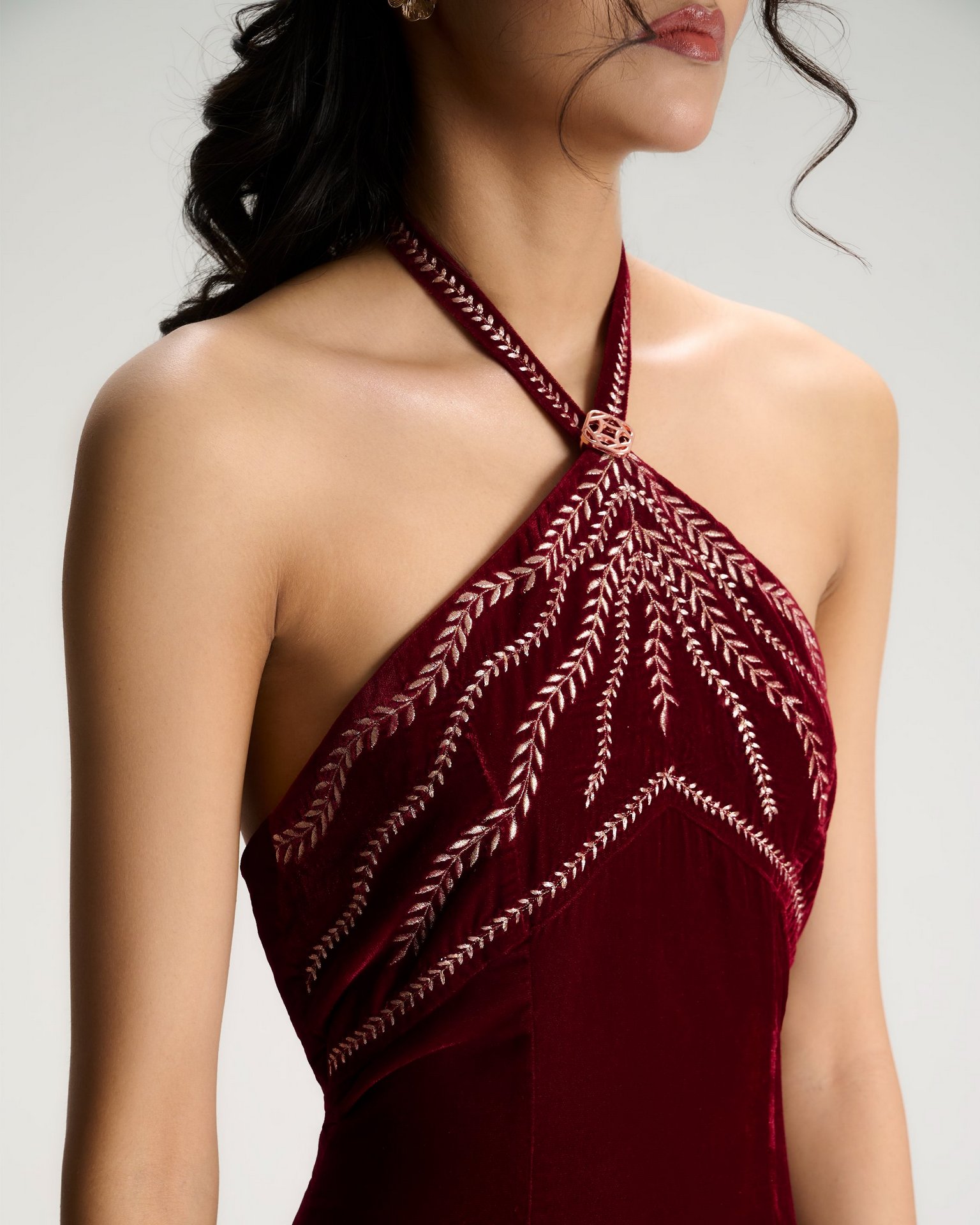 Vine-like embroidery follows the body’s natural lines, allowing structure and openness to exist in dialogue.