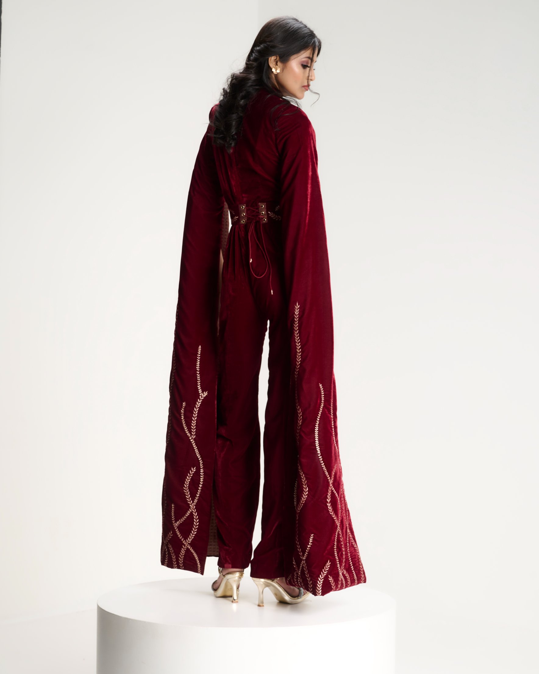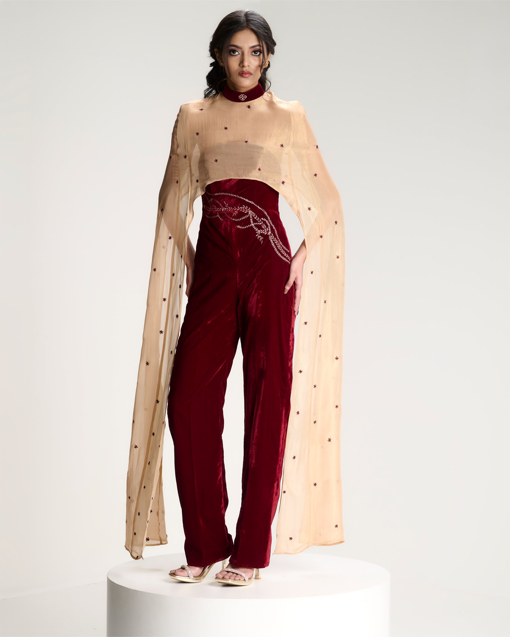 Grounded in structure, unfolding in bloom. A corseted jumpsuit anchors the body while a gold cape scattered with ritual florals moves around it in quiet reverence.