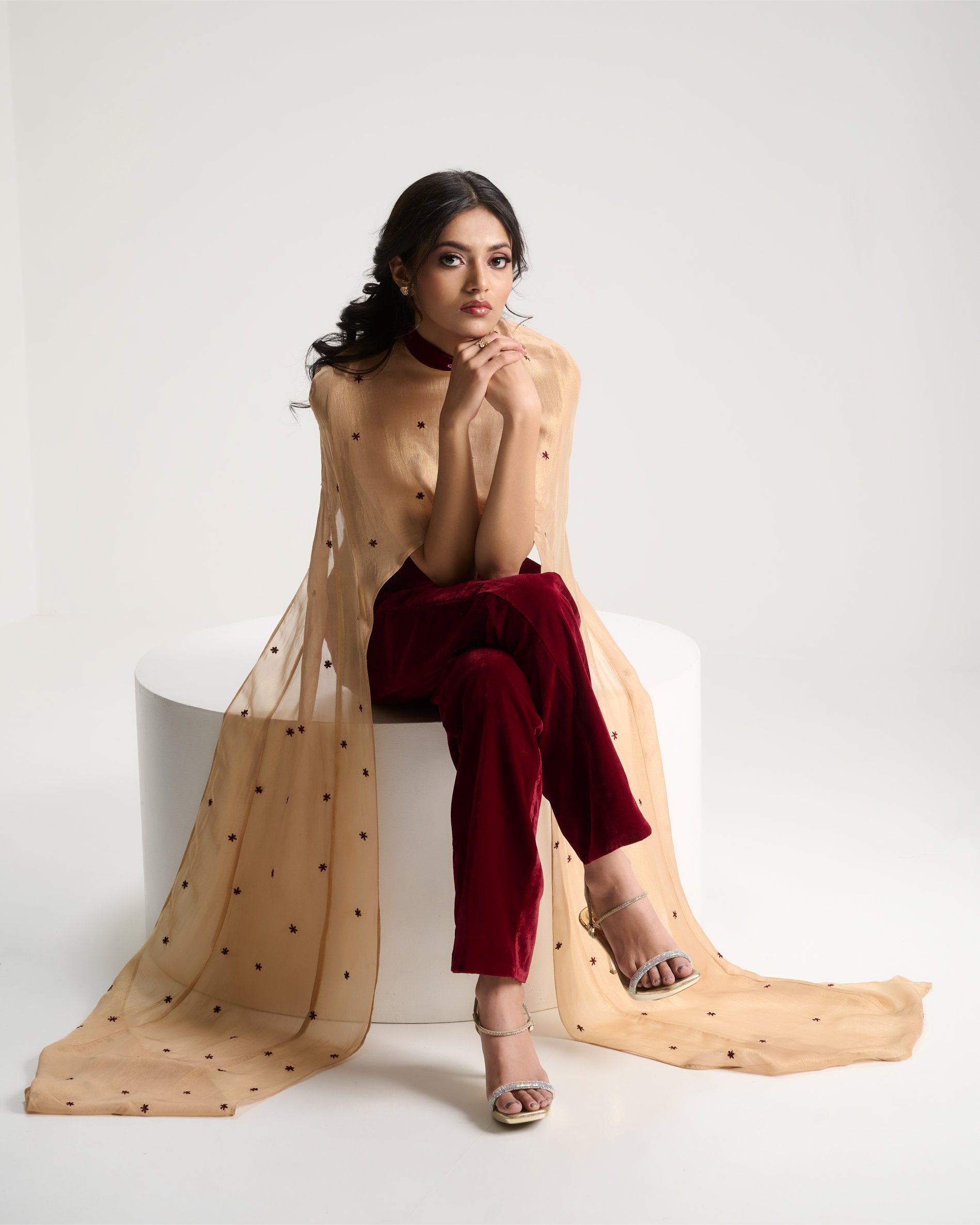 A moment of quiet before expression. Embroidery radiates from the waist like roots unfolding from a single point of origin. Kresha speaks of inner strength expanding outward into presence.