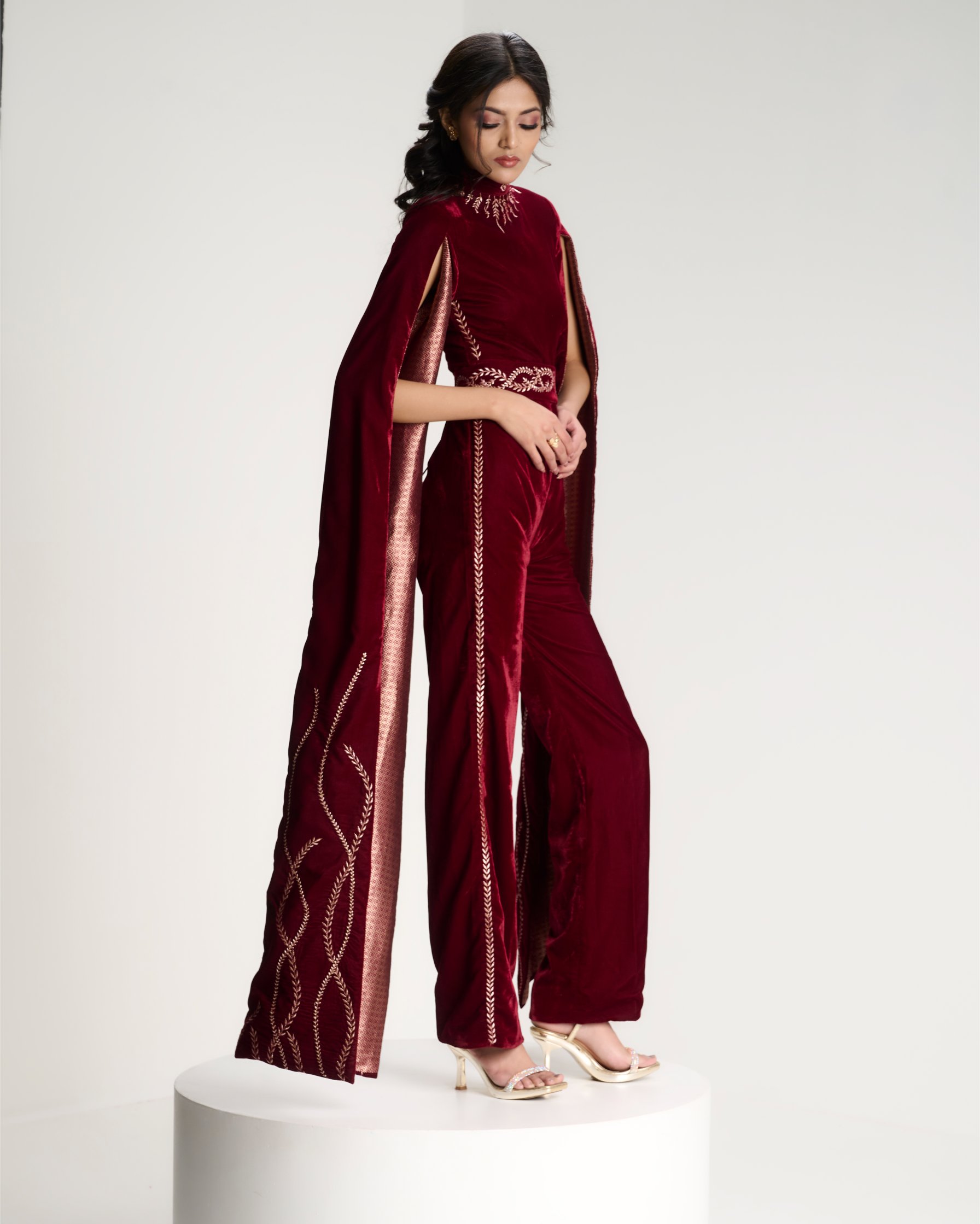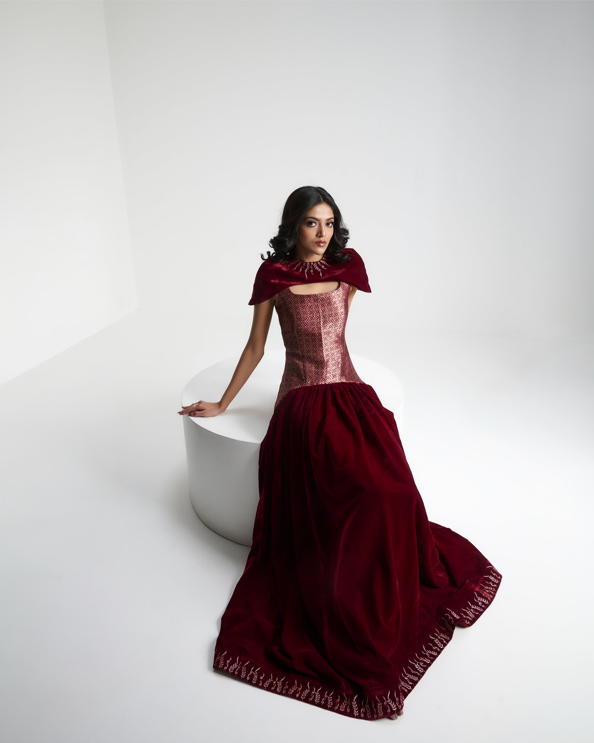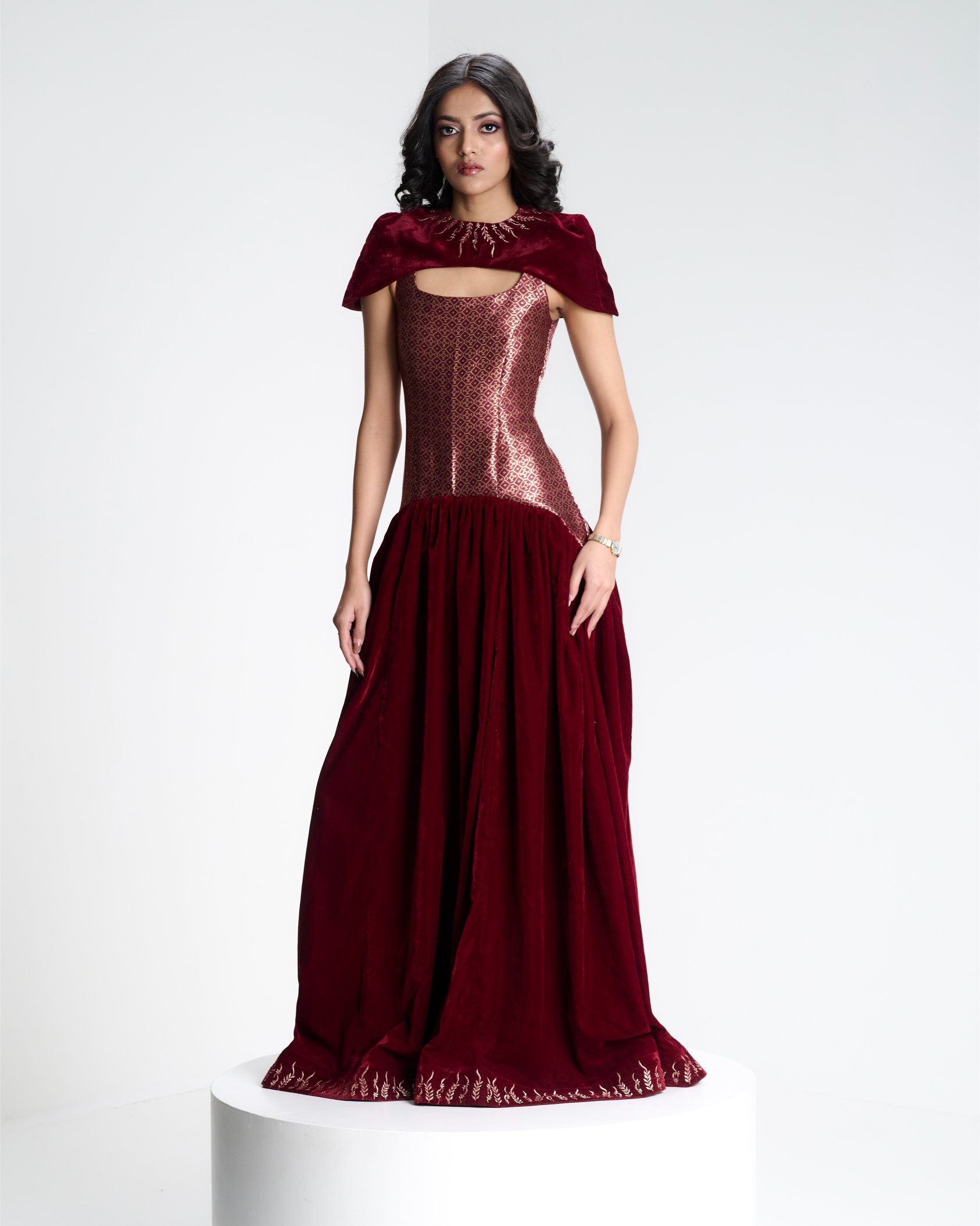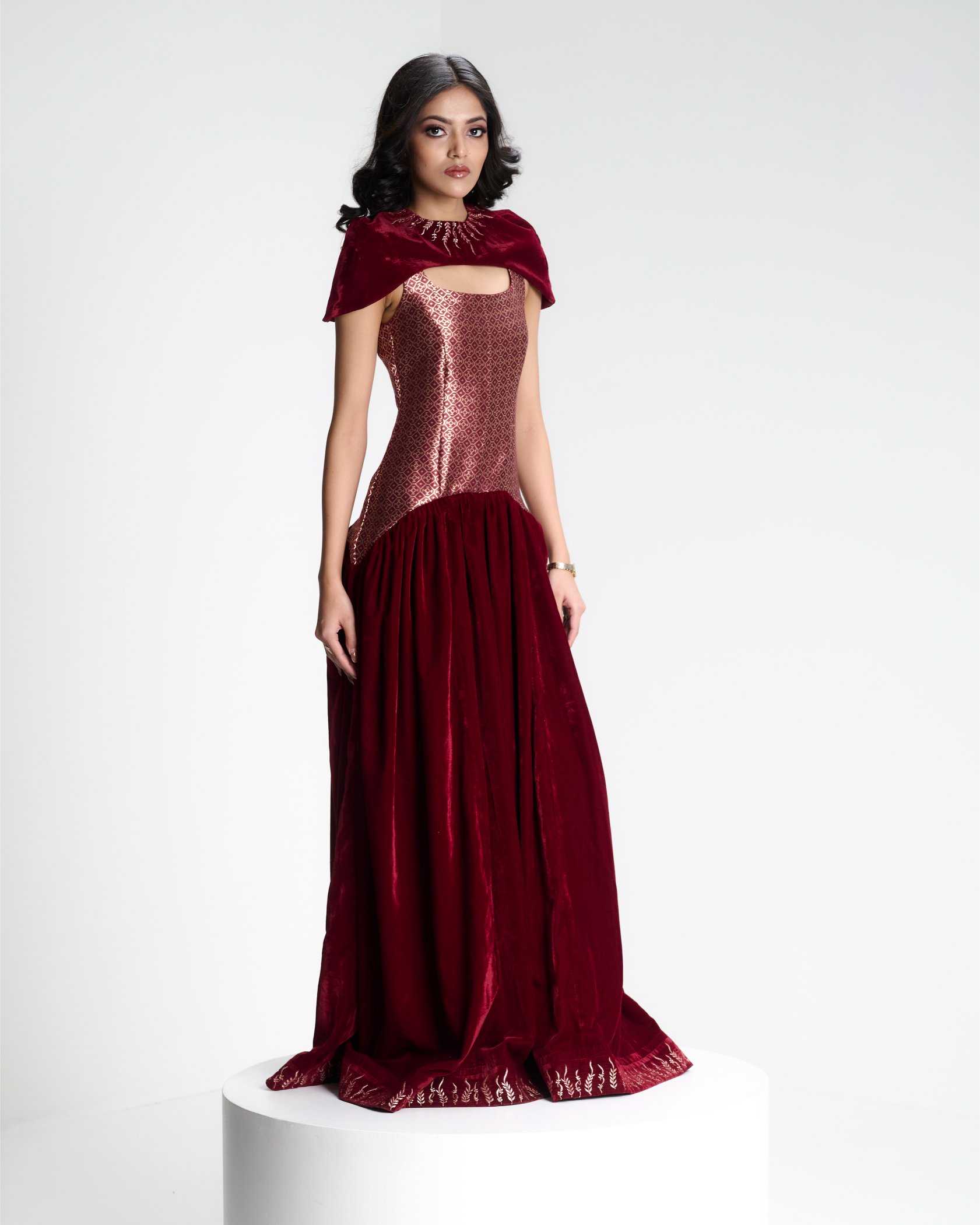 Banarasi zari meets sculpted velvet in a silhouette that balances heritage with modern form. Kailessa introduces the language of the house