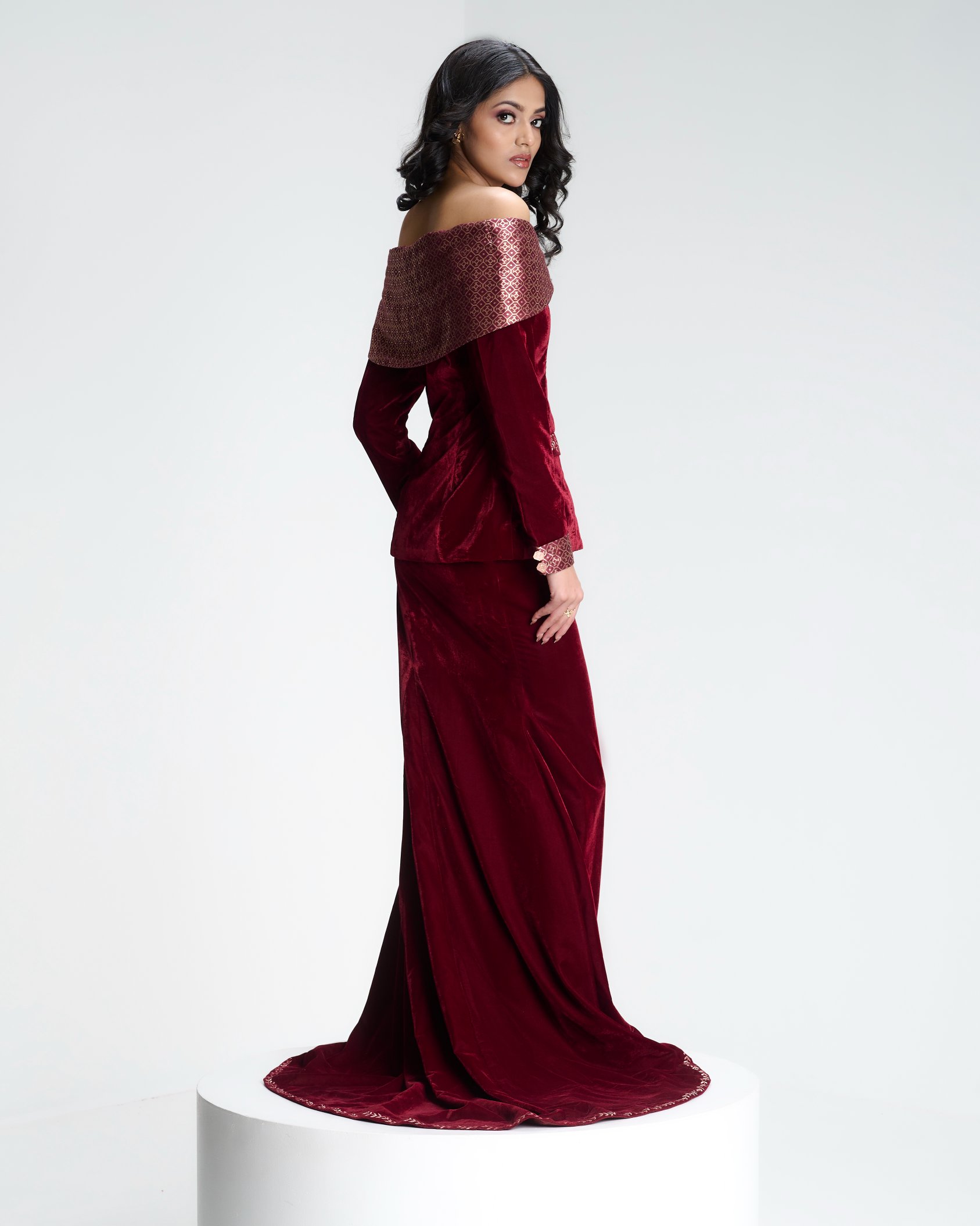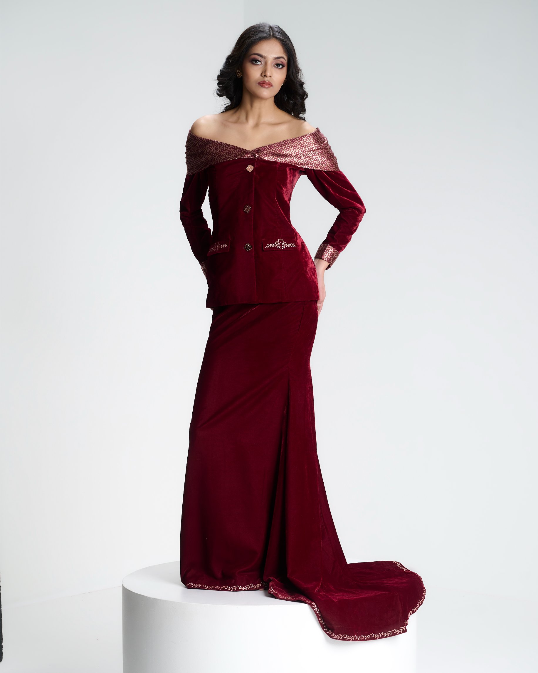An off-shoulder blazer opens into a flowing Banarasi drape, where tailoring meets the ritual language of wrapping.