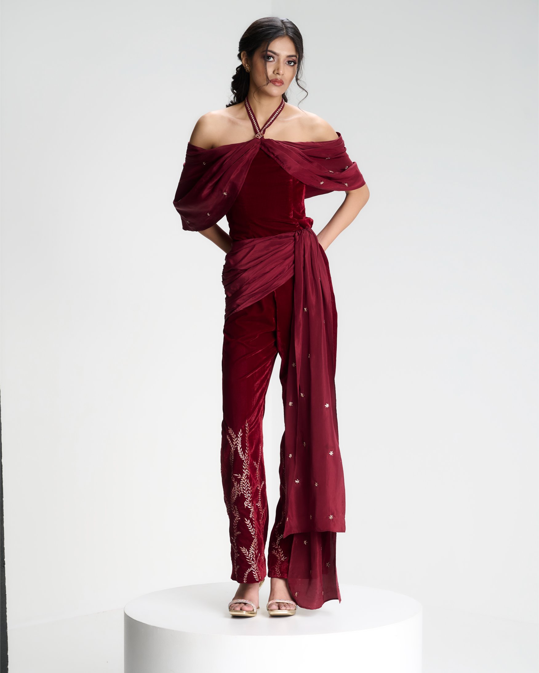 A halter-draped top falls in fluid folds above flared trousers that anchor the body in quiet balance.