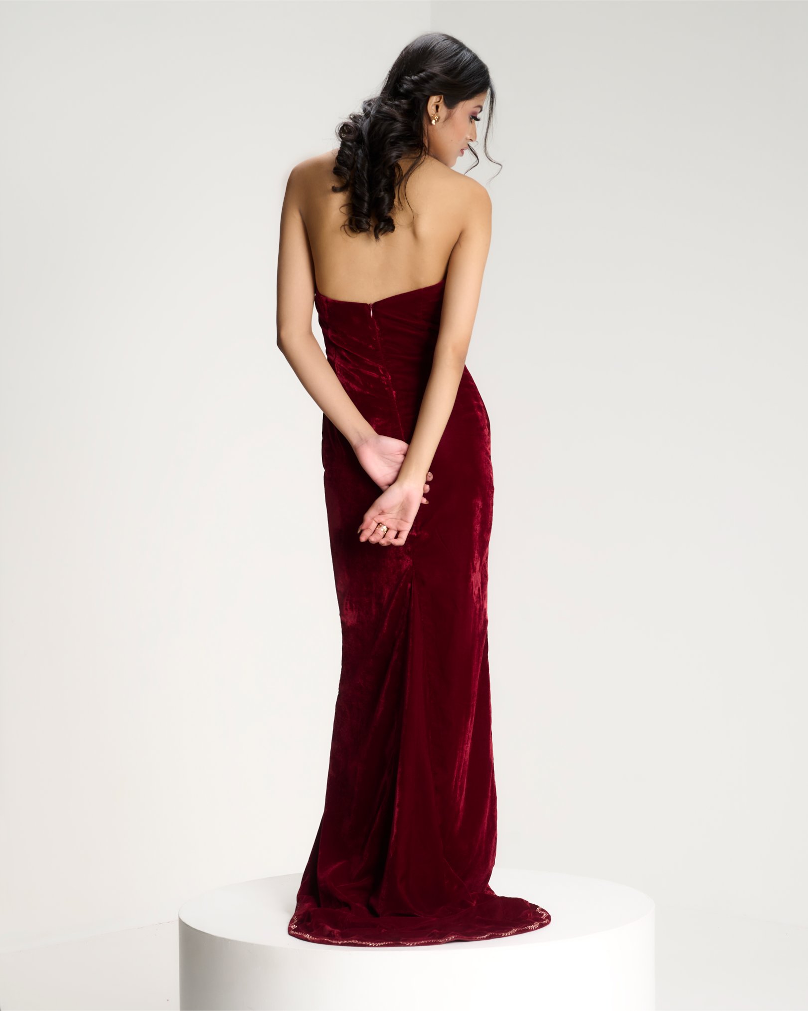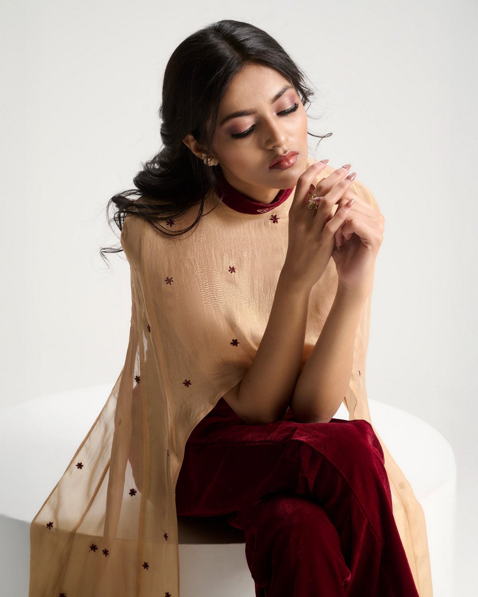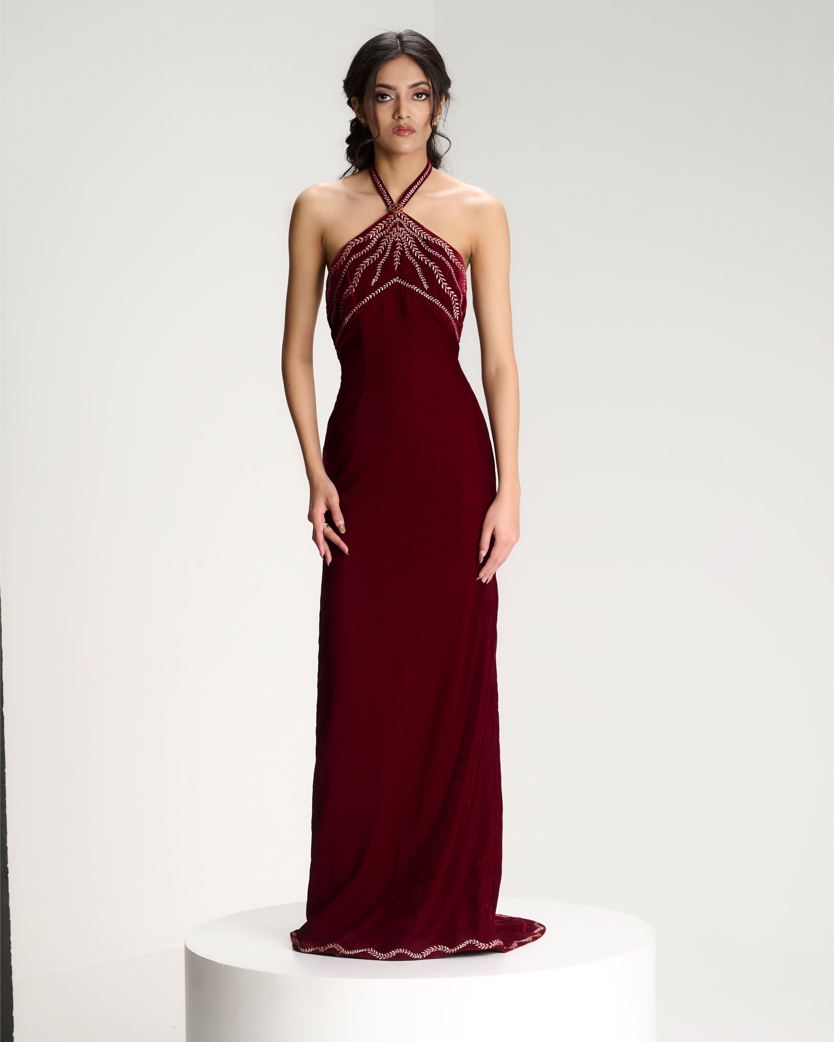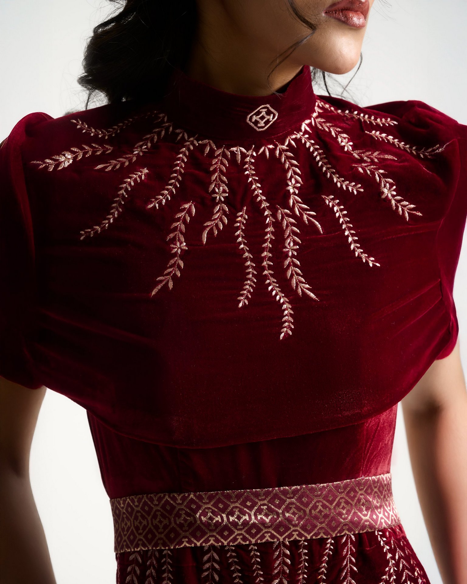 Discover the lookA moment of quiet before expression. Embroidery radiates from the waist like roots unfolding from a single point of origin. Kresha speaks of inner strength expanding outward into presence.