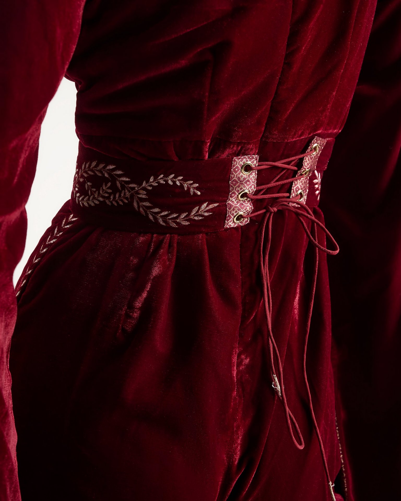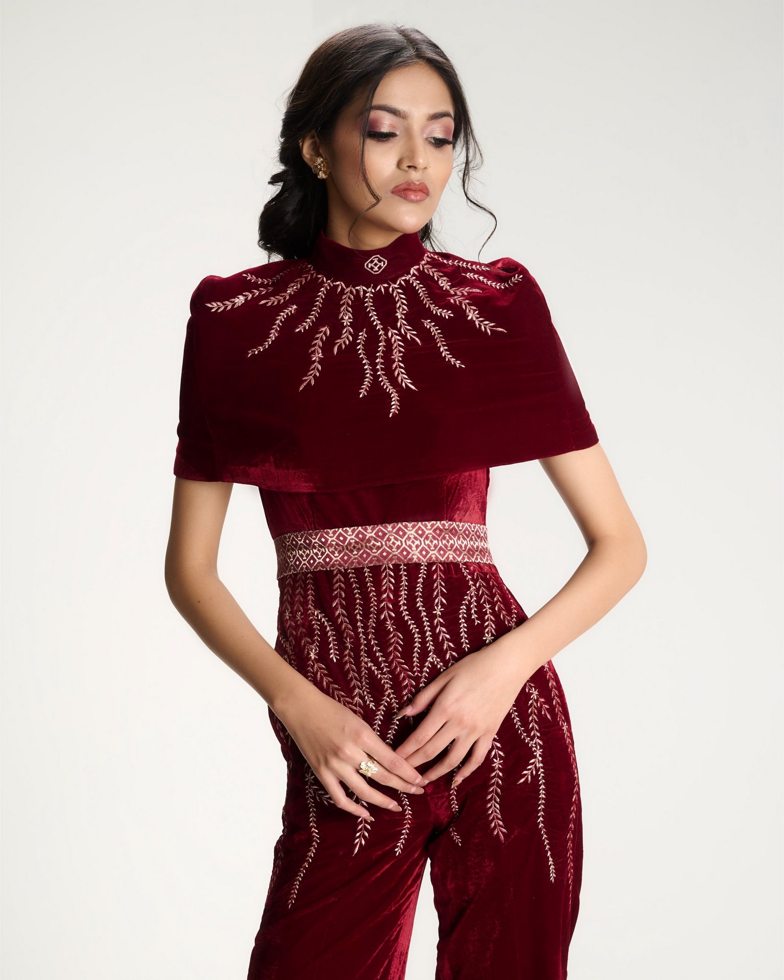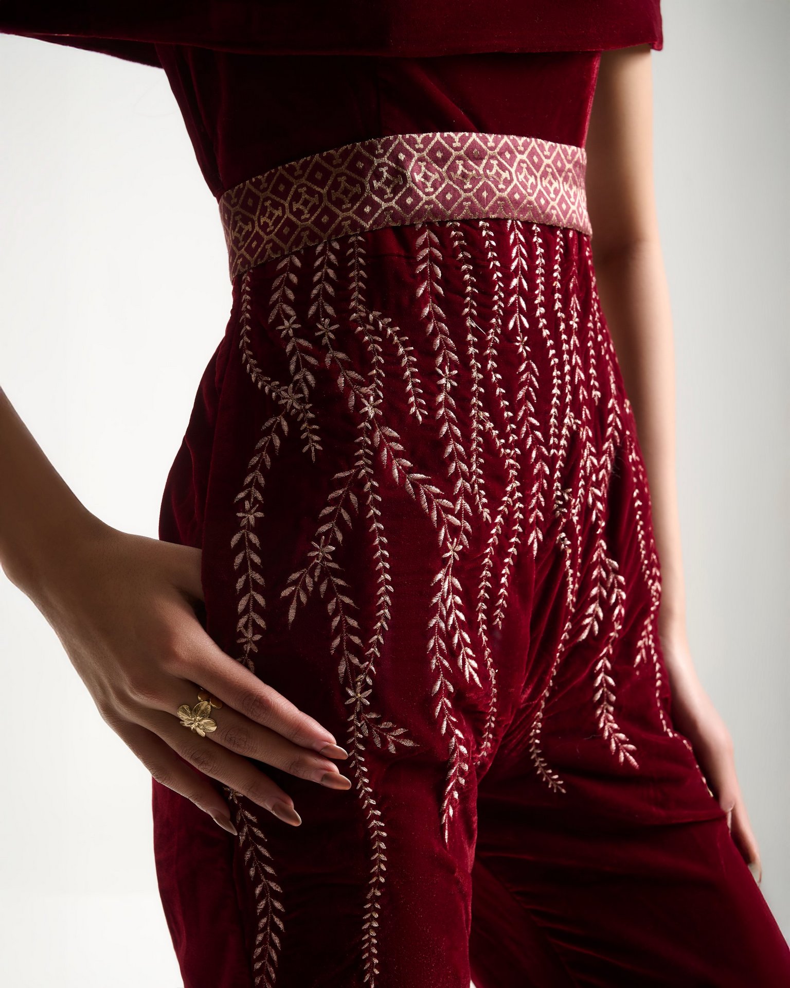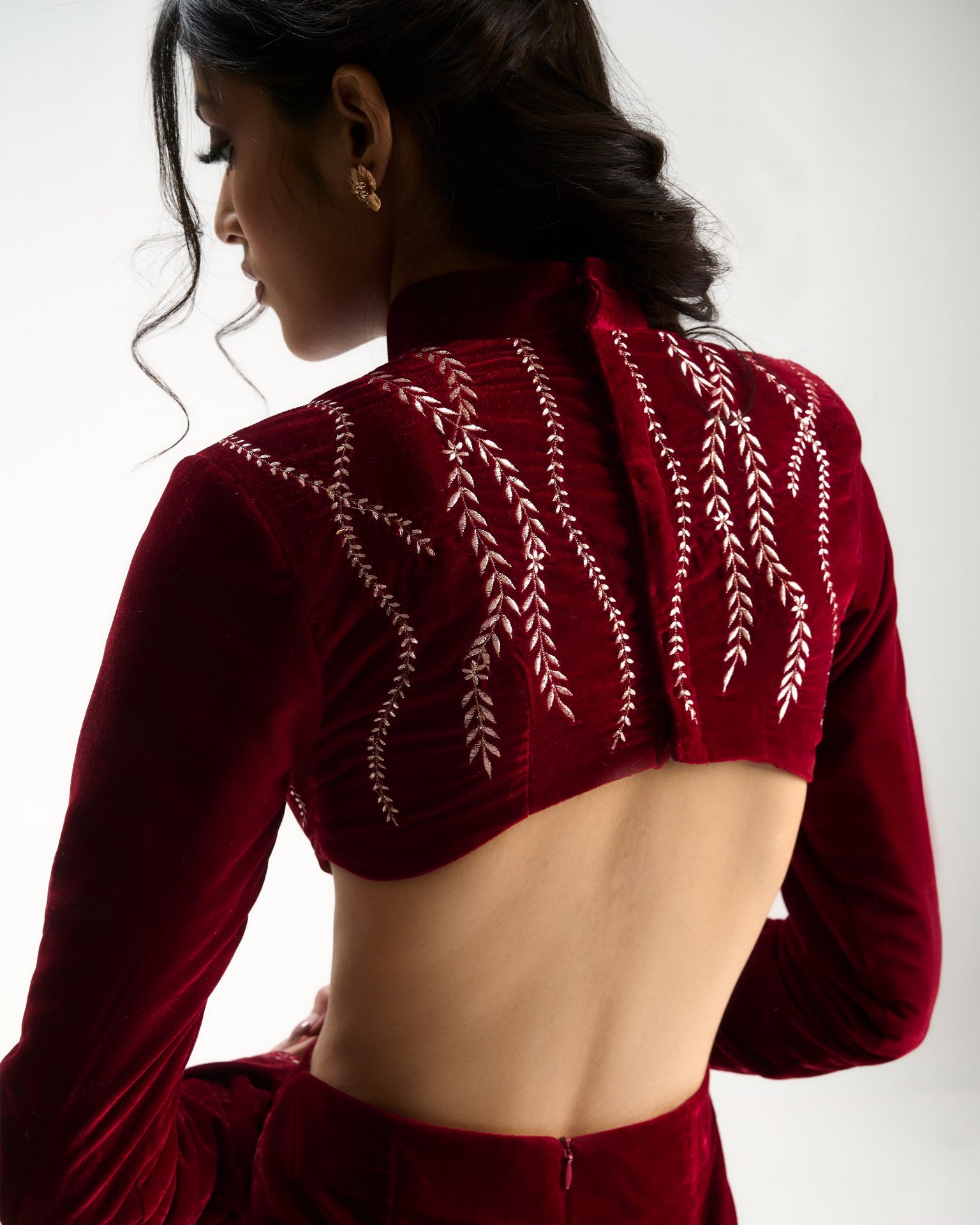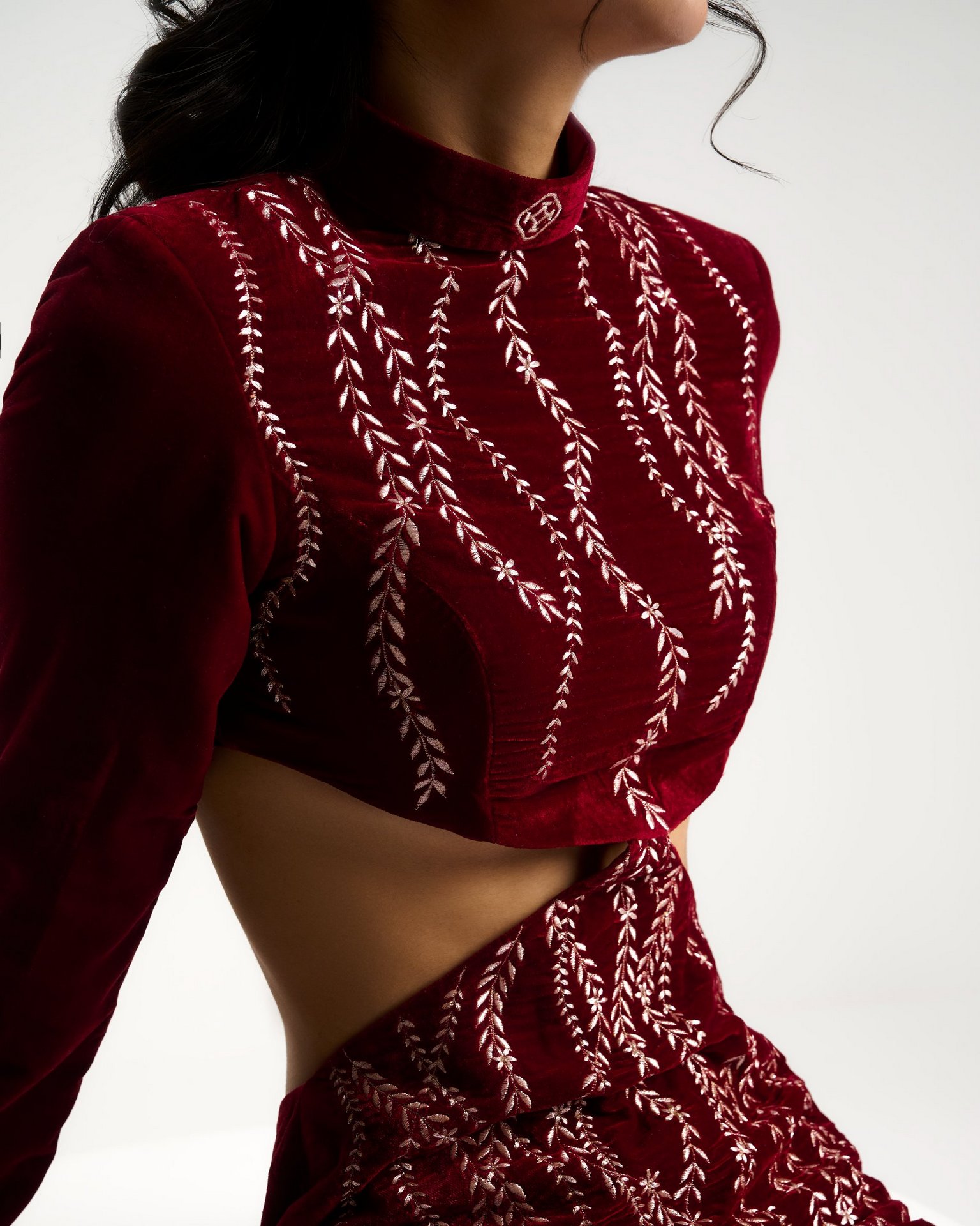 A moment of quiet before expression. Embroidery radiates from the waist like roots unfolding from a single point of origin. Kresha speaks of inner strength expanding outward into presence.