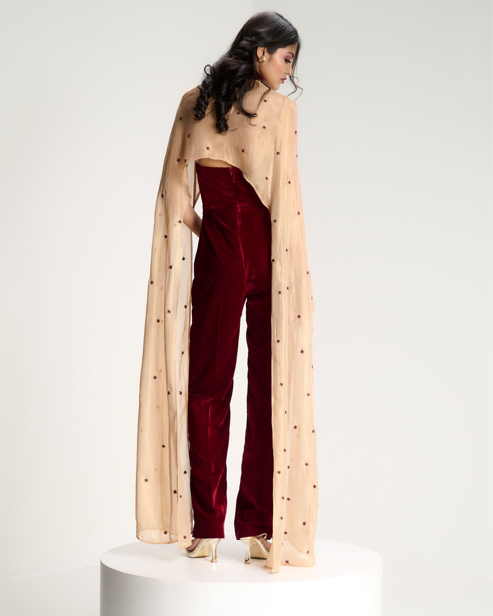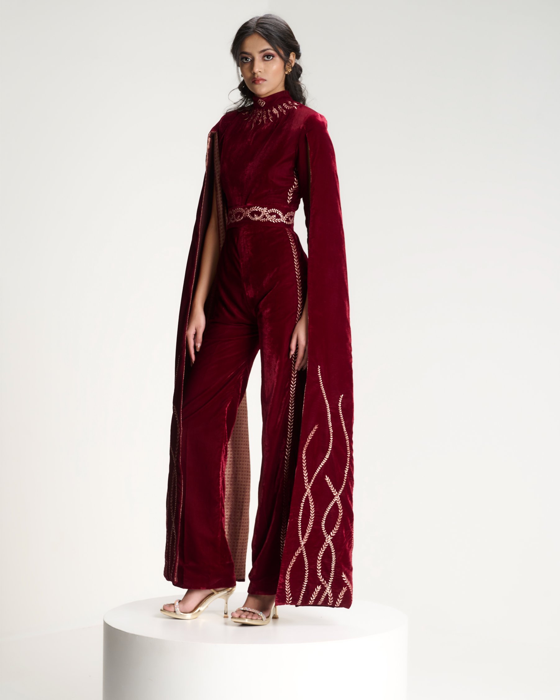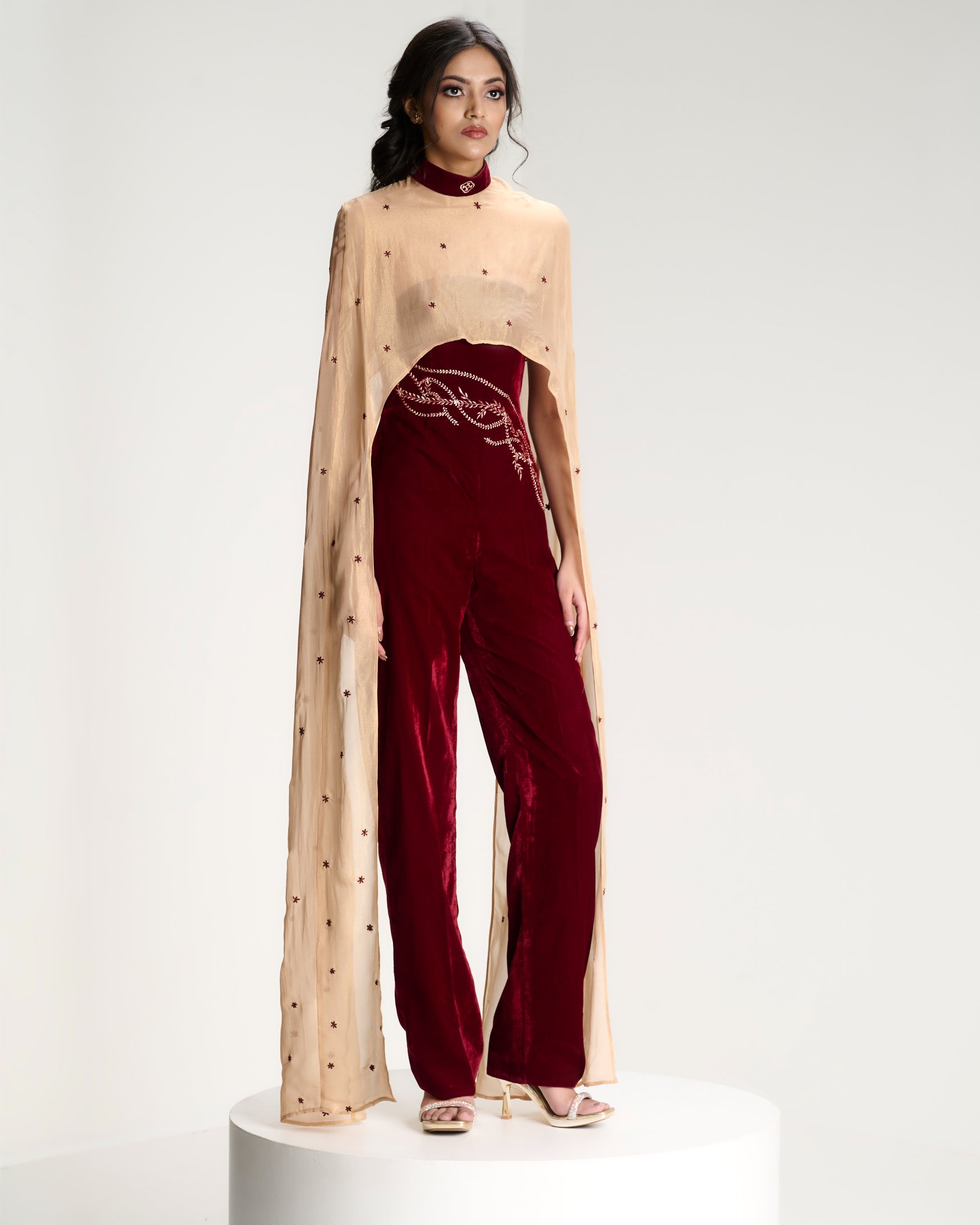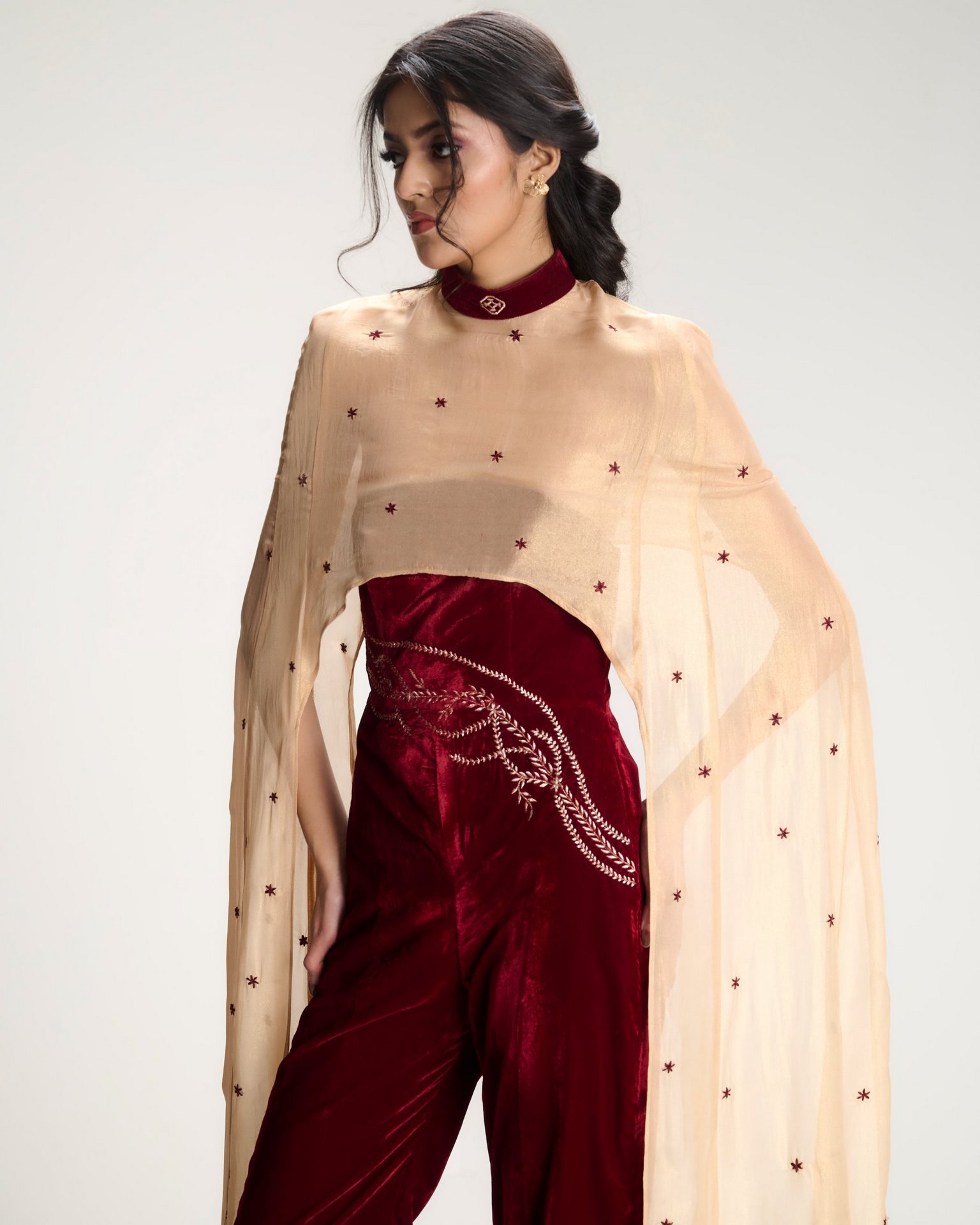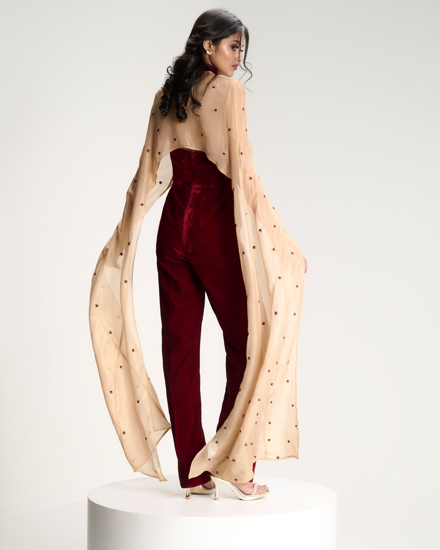 Grounded in structure, unfolding in bloom. A corseted jumpsuit anchors the body while a gold cape scattered with ritual florals moves around it in quiet reverence.