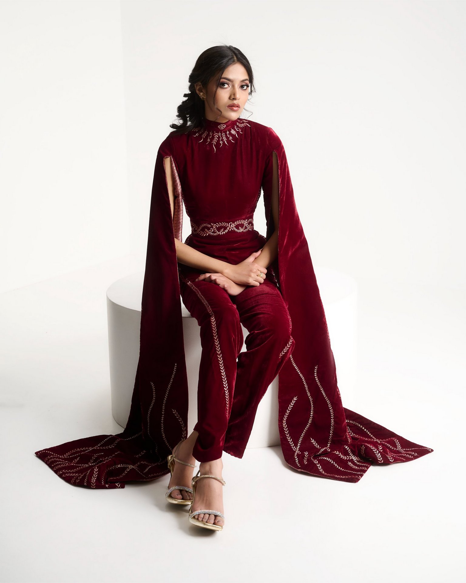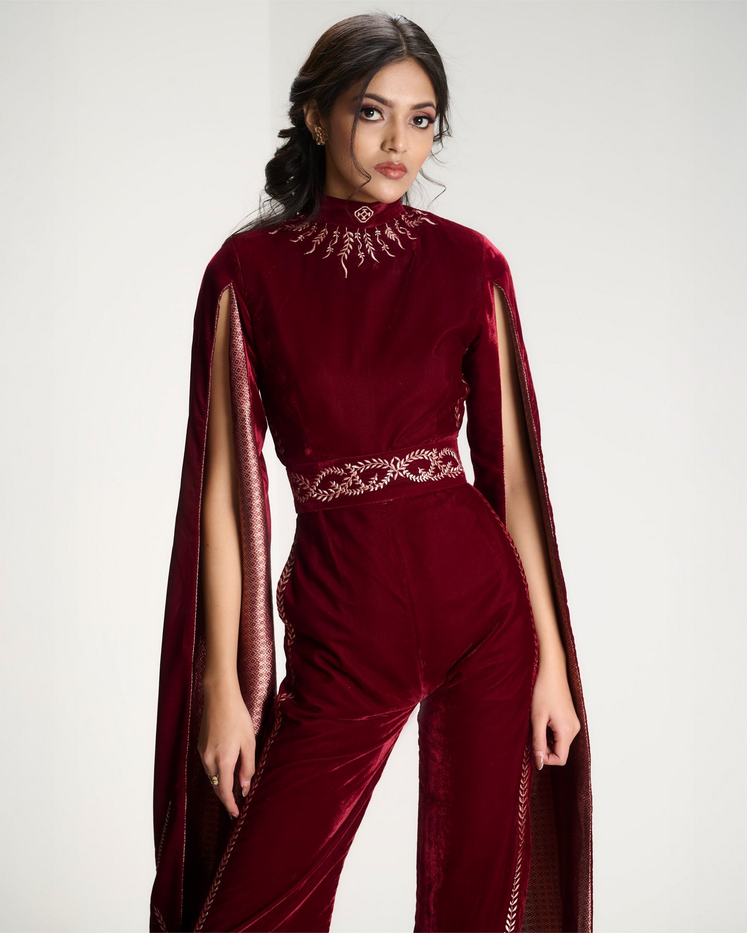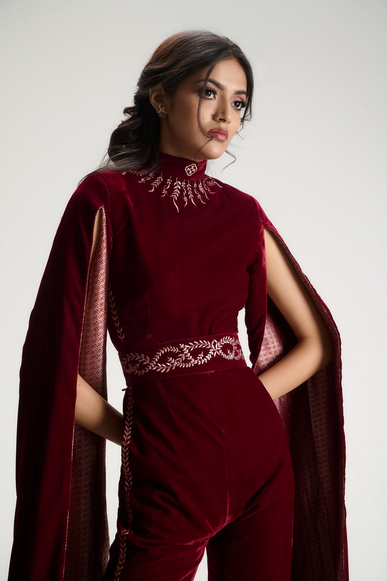 Adornment reimagined through structure. Embroidery traces the body like jewellery, sculpting a modern silhouette framed by fluid cape sleeves.